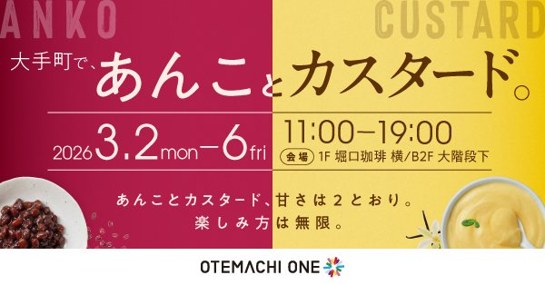大手町駅直結の複合施設「Otemachi One」は、2026年3月2日よりあんことカスタードのお店を集めたスイーツマルシェ「大手町で、あんことカスタード。」を開催、また、そのあとは3月9日から4月3日にかけて桜装飾を実施いたします。Otemachi Oneでの春をぜひ体感してください。