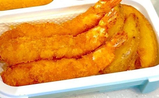 エビフライが3本、フライドポテトといった揚げ物メニューが詰められています。