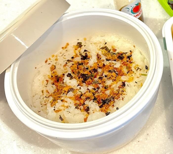 まずは、茶色系のふりかけがかかった白米を、おかずとは別の容器に用意した小倉さん。