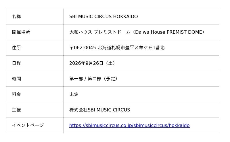 株式会社SBI MUSIC CIRCUS(本社:東京都港区、代表取締役社長:大付 楽洋、以下「当社」)は、2026年9月26日(土)、北海道・大和ハウス プレミストドームにてオールナイト音楽フェス「SBI MUSIC CIRCUS HOKKAIDO」を開催することとなりましたので、お知らせいたします。