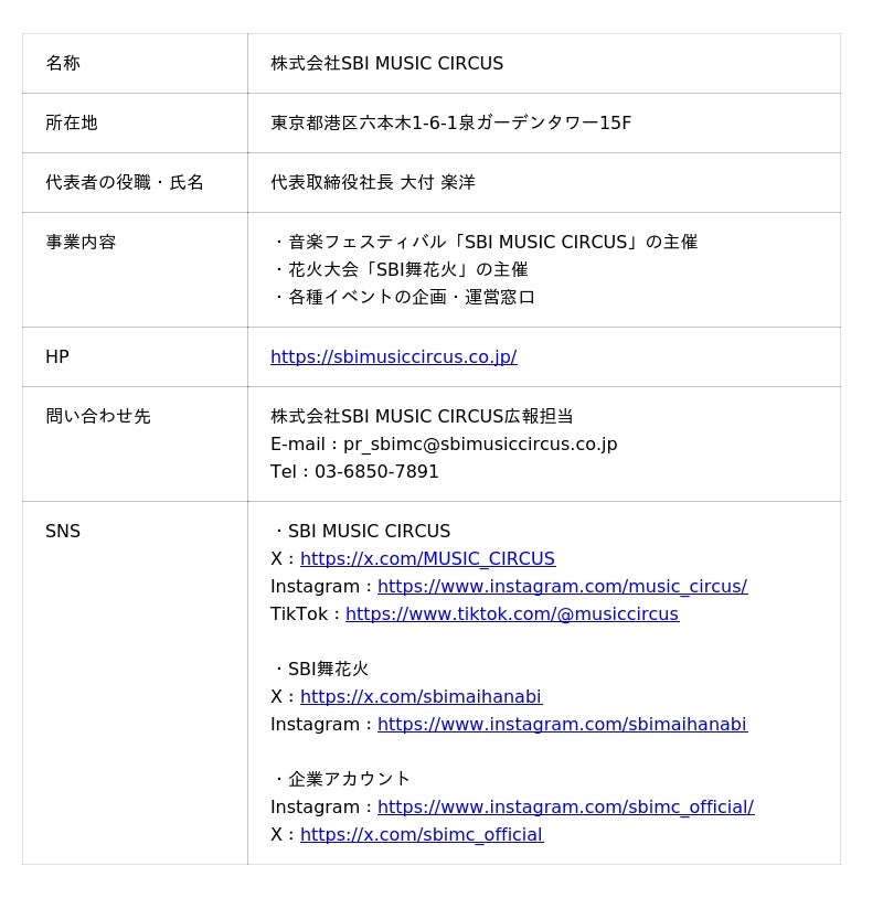 株式会社SBI MUSIC CIRCUSは、「エンタテインメントの力で、世界一笑顔を届ける」をミッションに掲げ、国内最大級の音楽フェスティバル「SBI MUSIC CIRCUS」や、関西最大級の花火大会「SBI舞花火」などを手掛けています。