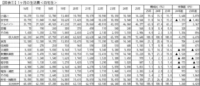 支出構造では、食費が増加する一方、交通費・教養娯楽費の抑制、学習関連支出(書籍・勉学費)の低下がみられた。とくに書籍費は2016年以降はじめて1,000円を下回った。