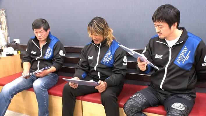 新日本プロレスの道場で入門テストに挑んだ練習生たち。オカダ選手が見守るなか、試験官の棚橋弘至選手、田口隆祐選手、小林邦昭さんを前に、体力審査をこなしてテストの前半を終えます。