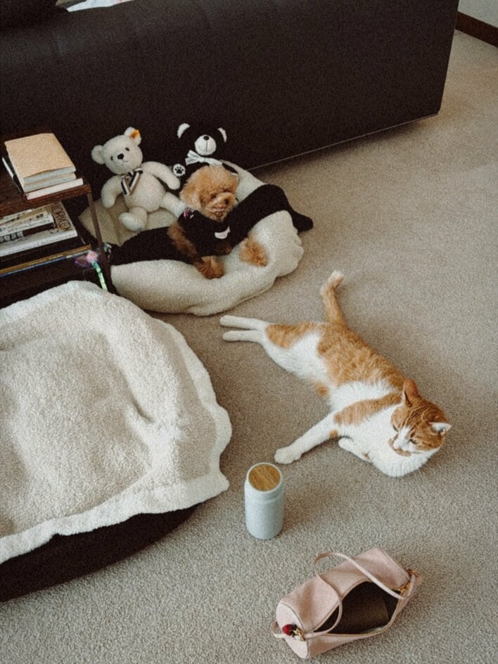 床には、愛犬と愛猫がそれぞれリラックスしていて、なんともキュート!