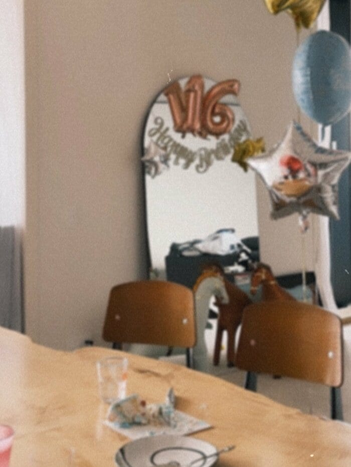 木目調の大きなダイニングテーブルが目を引く、自宅の様子を収めたショットを見ると、壁にかけられた全身鏡に16の数字のバルーンが飾られています。ゴールドやシルバー色の星型のバルーン、お馬さんのバルーンなど盛りだくさんに用意されていて、思わずテンションが高まりそうです。