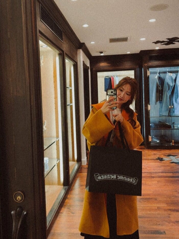 黒の買い物袋を持って鏡の前で自撮りをしていました。