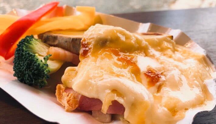 視覚と嗅覚を揺さぶる「黄金のラクレット」大きなホイールチーズの断面を専用ヒーターで熱し、とろとろに溶けた瞬間に目の前で削ぎ落とす「ラクレット」の販売。