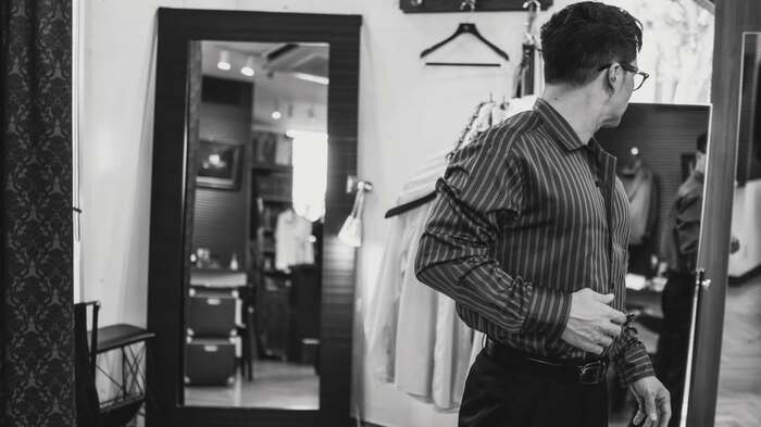ストライプ柄のシャツに袖を通し、ミラー越しに自身の後ろ姿を確認しているようなショットは、シャツの上からでもはっきりと分かるほど胸板が分厚く、鍛え抜かれた肉体ががっちりとした体格を、より際立たせています。