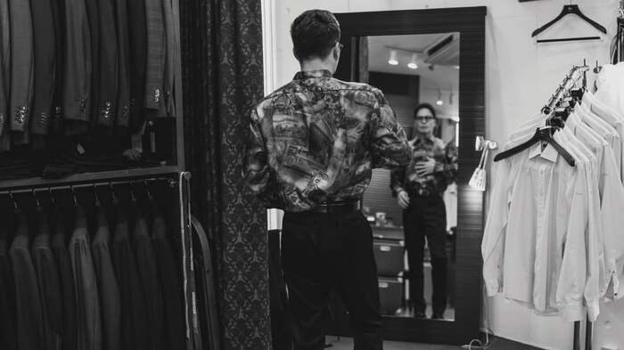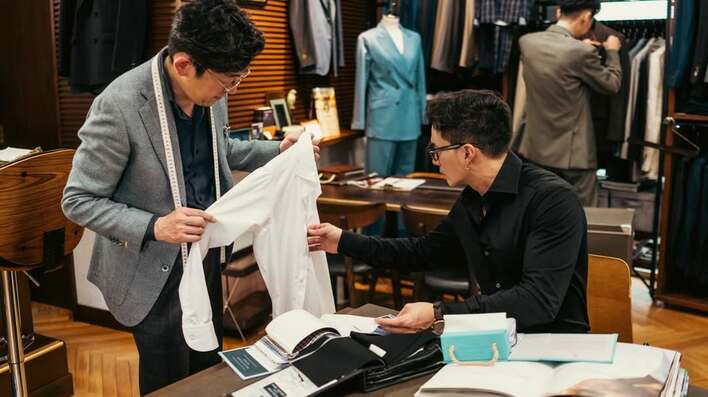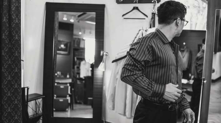 今回の投稿で、オーダーシャツを作る様子を公開した市原さん。市原さんは、黒いシャツに黒縁メガネをかけたシックなスタイルでたくさんの資料が広げられたテーブルに座り、近くの男性が見せる白いシャツに手を伸ばして、真剣な表情で見つめています。