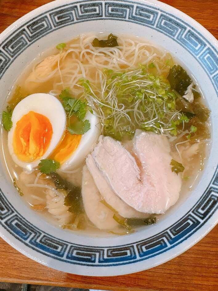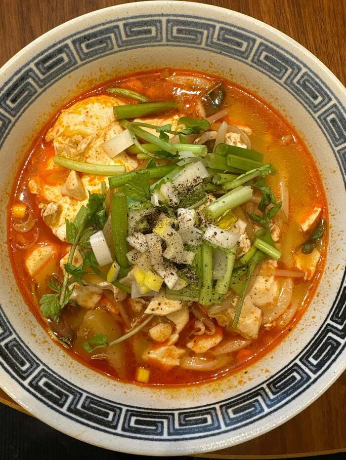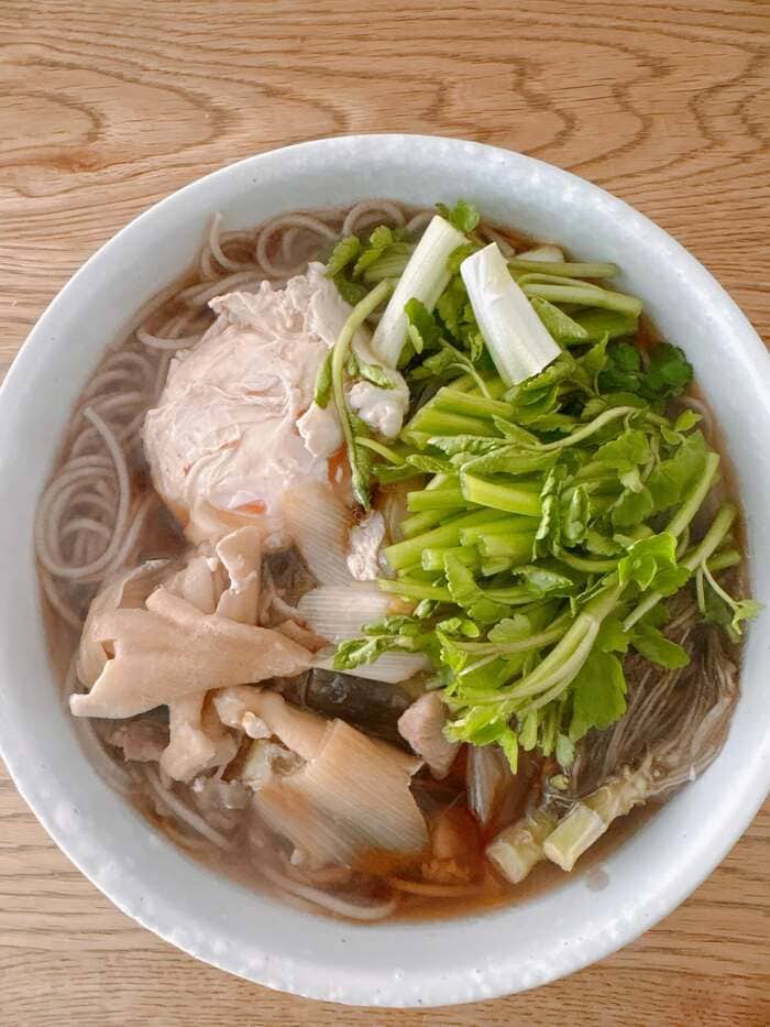 隣には、卵やネギ、お肉なども添えられていて、素朴ながらも具だくさんで豊かな一杯となっています。