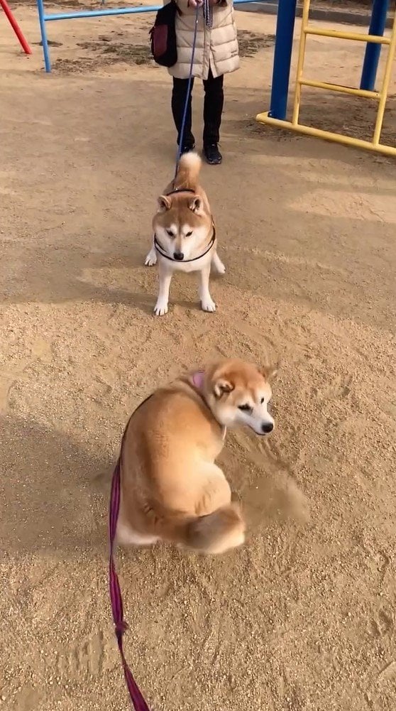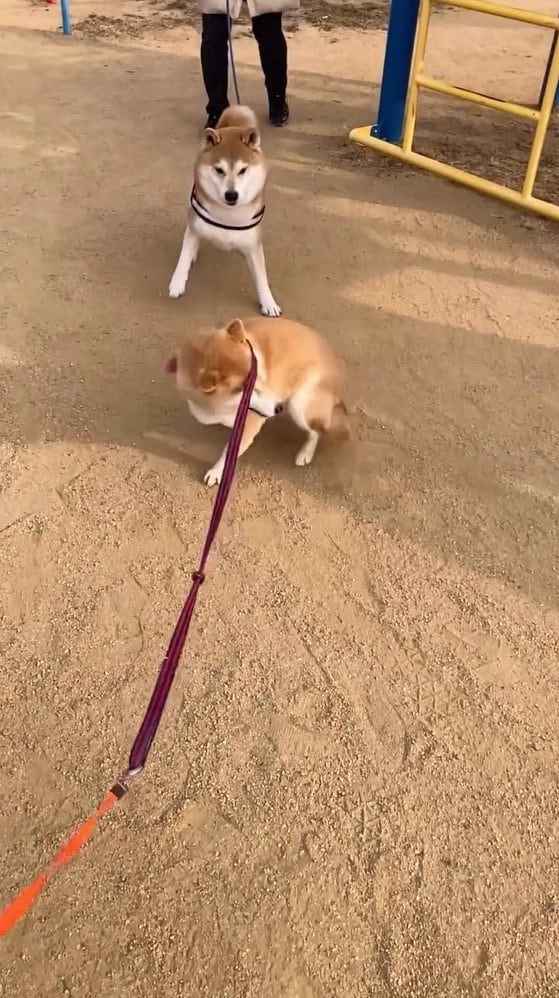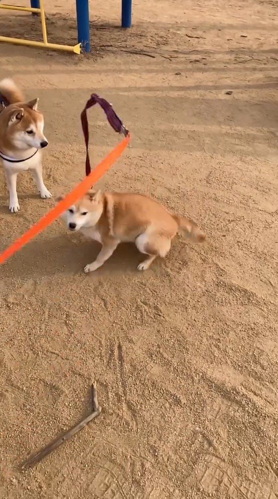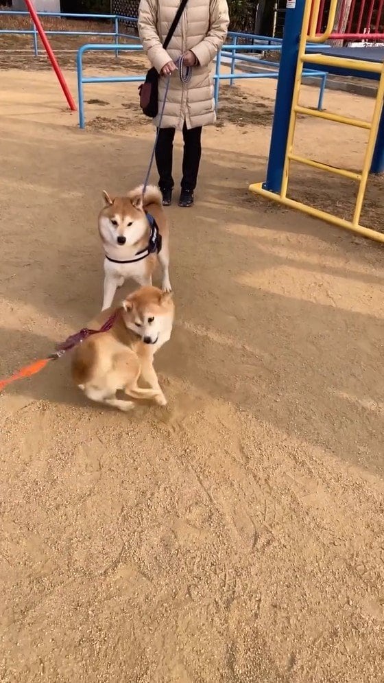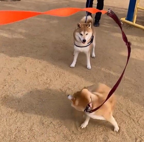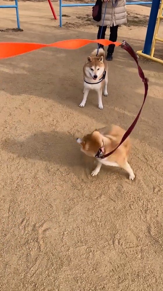 何度回ってもリードが絡まないよう、飼い主さんもうまくタイミングを合わせているようです。