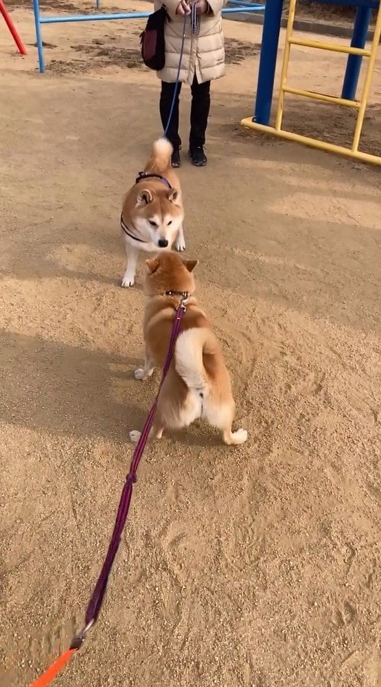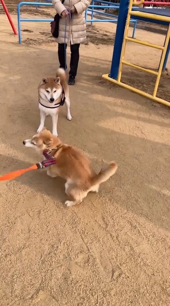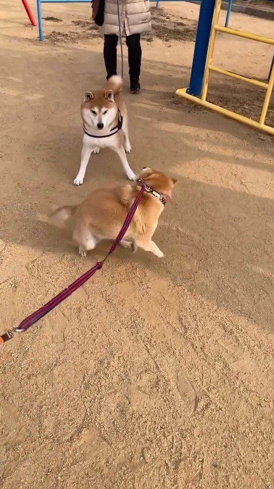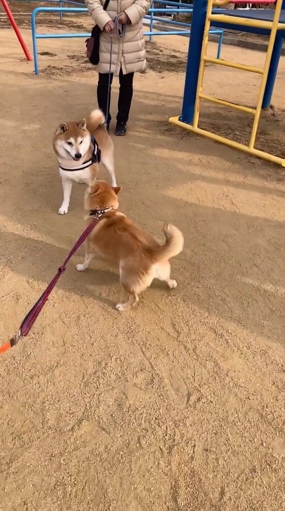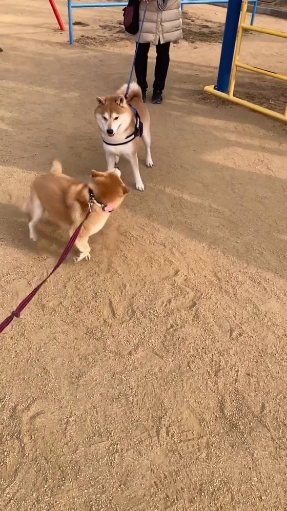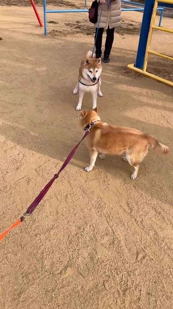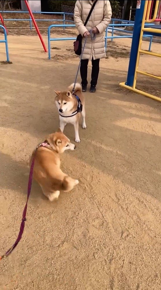 動画を見ると、広々とした公園でお友達の“イケワン”と向き合うマロンちゃんの姿が。