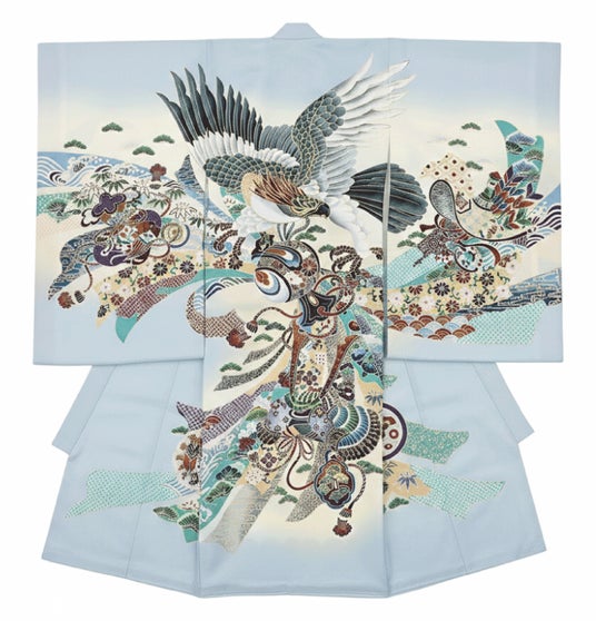 「鷹と兜とのし」化繊淡い水色をベースに、背中に向かって白やベージュへとやさしいグラデーションが印象的な一着です。柄の縁には金彩が施され、光を受けるたびに上品なきらめきを感じられます。落ち着きがありつつ、お祝いの日にふさわしい華やかさも備えています。