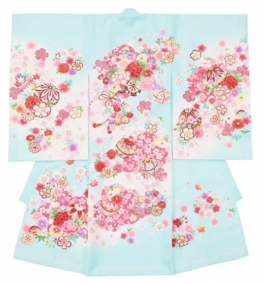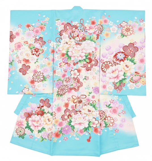 「鈴に芍薬」化繊美しい青空の色をベースに、白やピンクがふんわり重なるやさしい色合いの祝い着です。全体に花柄がたっぷり描かれていて、写真に写したときも明るく華やかな印象に。金糸がところどころに使われているので、可愛らしさの中にきちんとお祝い感も感じられます。「王道だけど、ちゃんと華やか」そんな一着を選びたい方におすすめです。