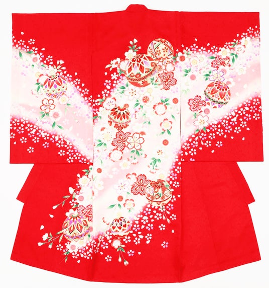 光の加減で浮かび上がる桜の織り模様が、上品な立体感と奥行きを生み出します。咲き誇る桜と花々が、赤地の美しさを引き立て、晴れの日にふさわしい華やかさを演出。金糸で縁取られた鞠がきらめき、可愛らしさと気品を添えています。