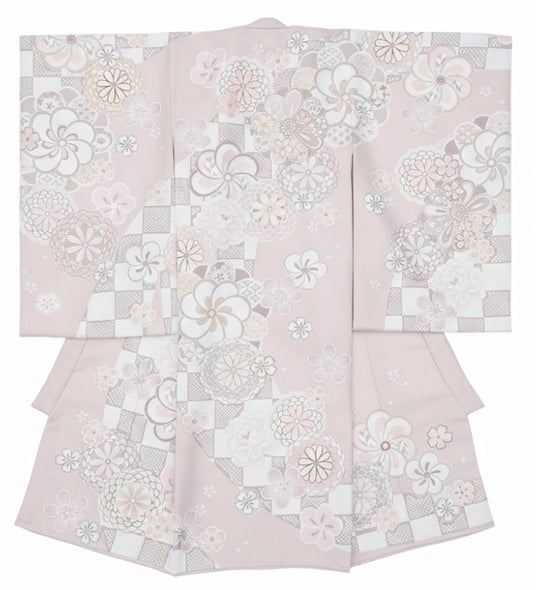 「ねじり梅と菊」化繊やさしいピンクベージュの色合いでまとめられた、落ち着きのある一着です。赤やピンクの王道とは少し違い、今っぽくて大人っぽい雰囲気があり、スタジオ撮影やナチュラルな写真にもよくなじみます。色数を抑えている分、柄や刺繍の立体感がほどよく引き立ち、可愛さの中にも上品さを感じられるのが印象的です。
