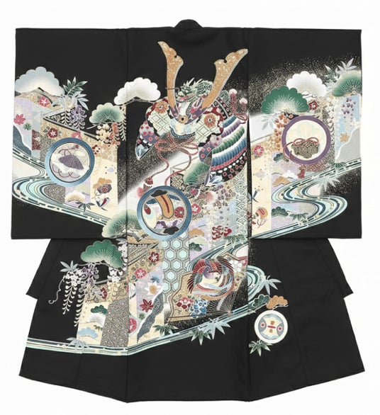 「兜と松寿の風に太鼓と几帳」正絹漆黒の生地が印象的な、力強さと気品を兼ね備えた一着。中央には勇ましい兜が描かれ、健やかな成長と強さへの願いが込められています。周囲に配された松は一年を通して青々とした葉を保つことから、長寿や繁栄を象徴する吉祥文様。上向きに伸びる松葉には、まっすぐに成長してほしいという想いが込められています。