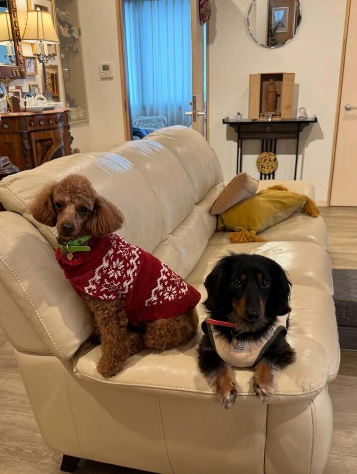 公開された写真を見てみると、上品なアイボリーの革張りのソファに座り、カメラを見つめる2匹の姿が。2匹はリビングのソファでくつろいでいるようで、背景には、仏像が置かれたアンティーク調のコンソールや、雑貨が置かれたチェストなどが配置されています。