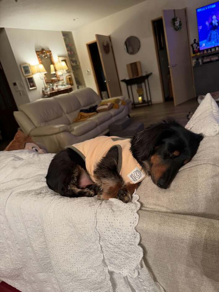 そして、広々とした部屋全体をおさめたショットでは、愛犬がベージュのソファの背もたれ部分にちょこんと寝転がり、スヤスヤと気持ちよさそうに眠っている様子も。