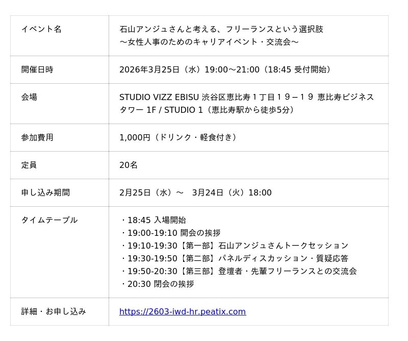 国内最大級のITフリーランス向けエージェント「TECHBIZ」をはじめとした、フリーランスと企業のマッチングサービスを運営する株式会社テックビズ(本社:東京都渋谷区、代表取締役:中島一樹、以下「テックビズ」)は国際女性デーに合わせた特別企画として、「自分らしいキャリア・働き方」をテーマにしたトークイベント・交流会を2026年3月25日(水)19:00より、STUDIO VIZZ EBISUにて開催いたします。登壇者には、シェアリングエコノミー協会共同代表理事として政府と民間の架け橋となり、個人が主体となる新しい働き方の普及に取り組んできた石山アンジュさんをお招きし、フリーランスという選択肢のリアルについてお話しいただきます。また、テックビズが運営する人事職特化のフリーランスエージェント「HRBIZ」で女性フリーランス人事として活躍するモデレーターとのパネルディスカッションも行い、参加者同士が横のつながりを築ける交流の場も設けます。