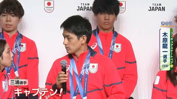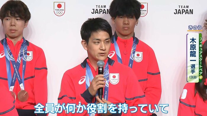 アイスダンスの森田真沙也選手が団体のキャプテンを務めていたことを忘れないよう、すぐさま三浦選手がフォローする、“あうん”の呼吸が光りました。