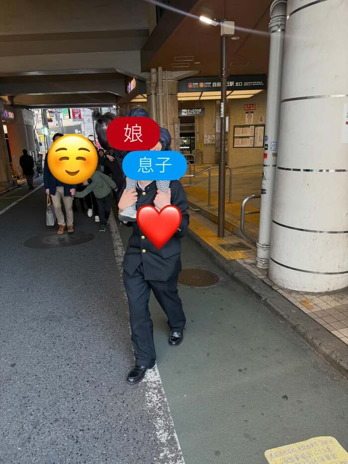 そこには、学ランに身を包んだ中学生の長男が、2歳の妹を肩車している姿が。