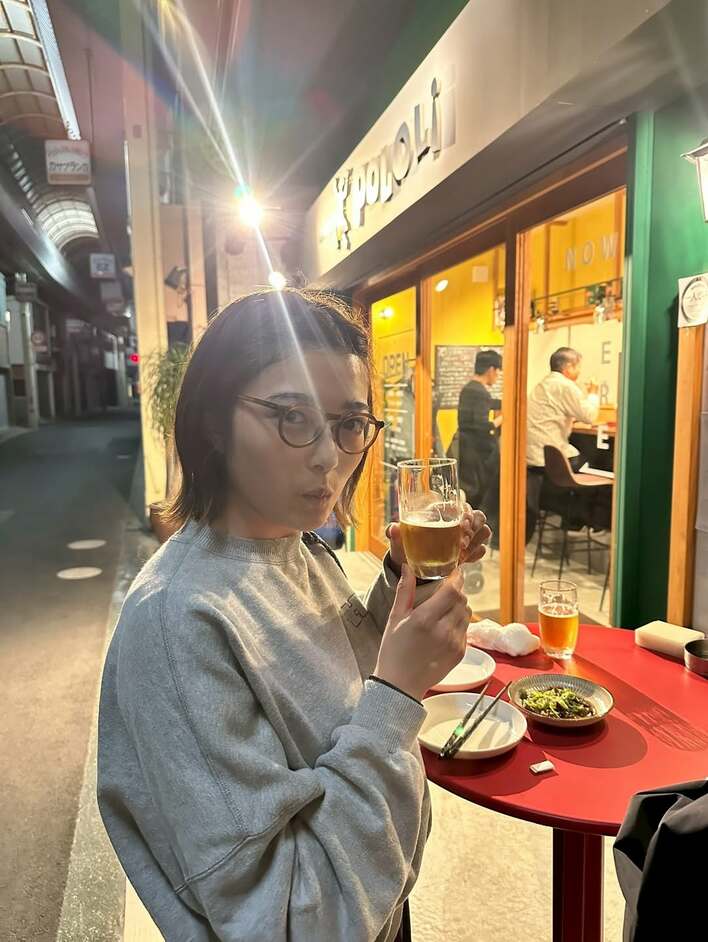 ロケで訪れたという愛媛県八幡浜市でのショットには、ご機嫌な表情でビールを持ち、外飲みを楽しんでいる井上さんの姿が。メガネにグレーのトレーナーを合わせたラフなスタイルです。