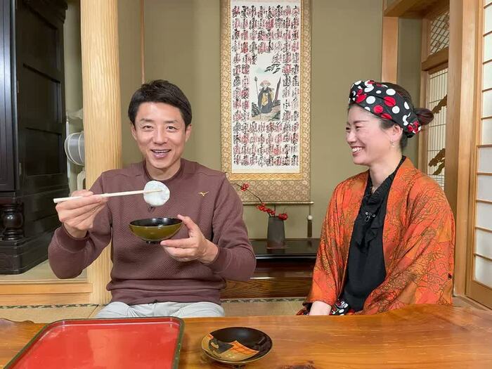 雑煮の内容の説明をしようとする北川さんに、自分で気付いて驚きたい松岡さんは「何も言わないでください」と制して北川さんと笑い合う一幕も。そして、丸いおもちを食べ始めた松岡さんは「…ん?あんこですか?」と目を見開きます。
