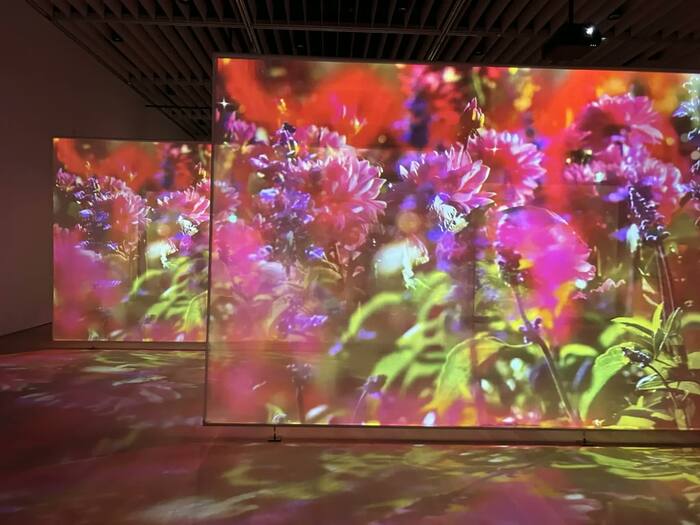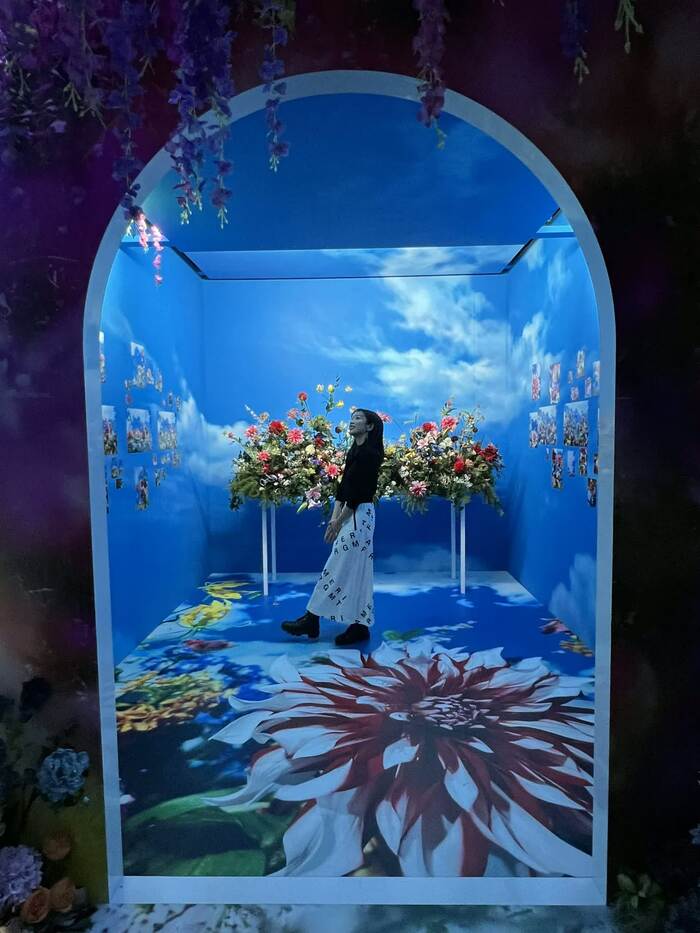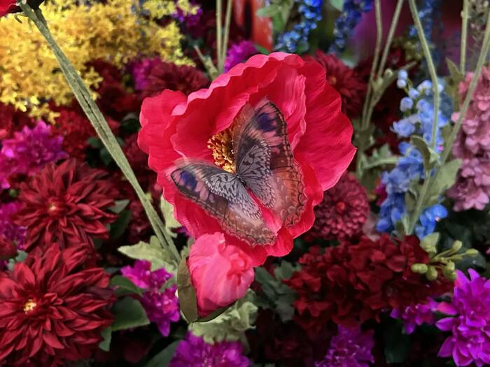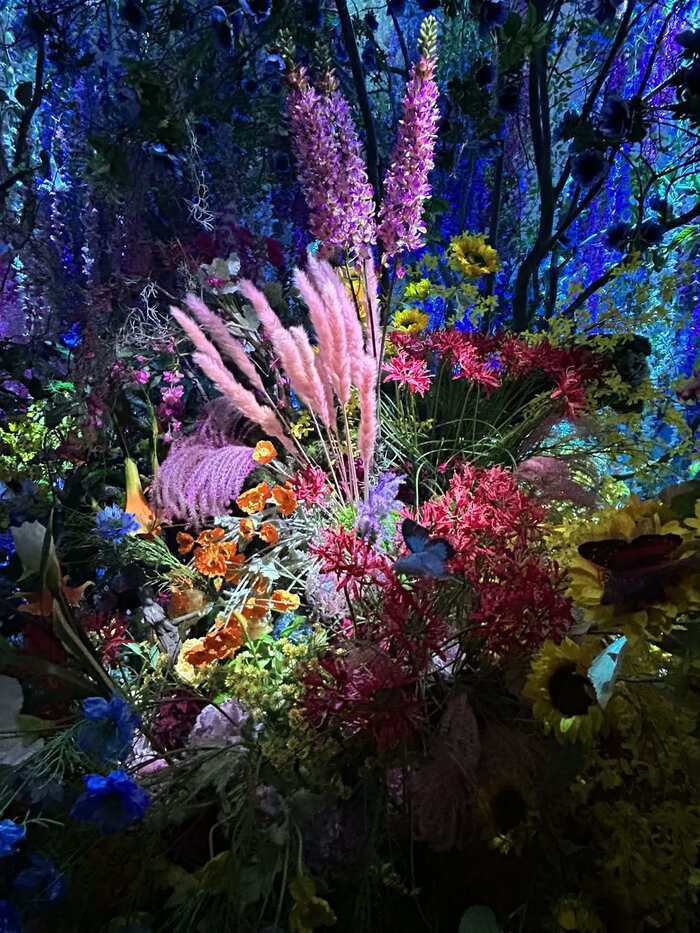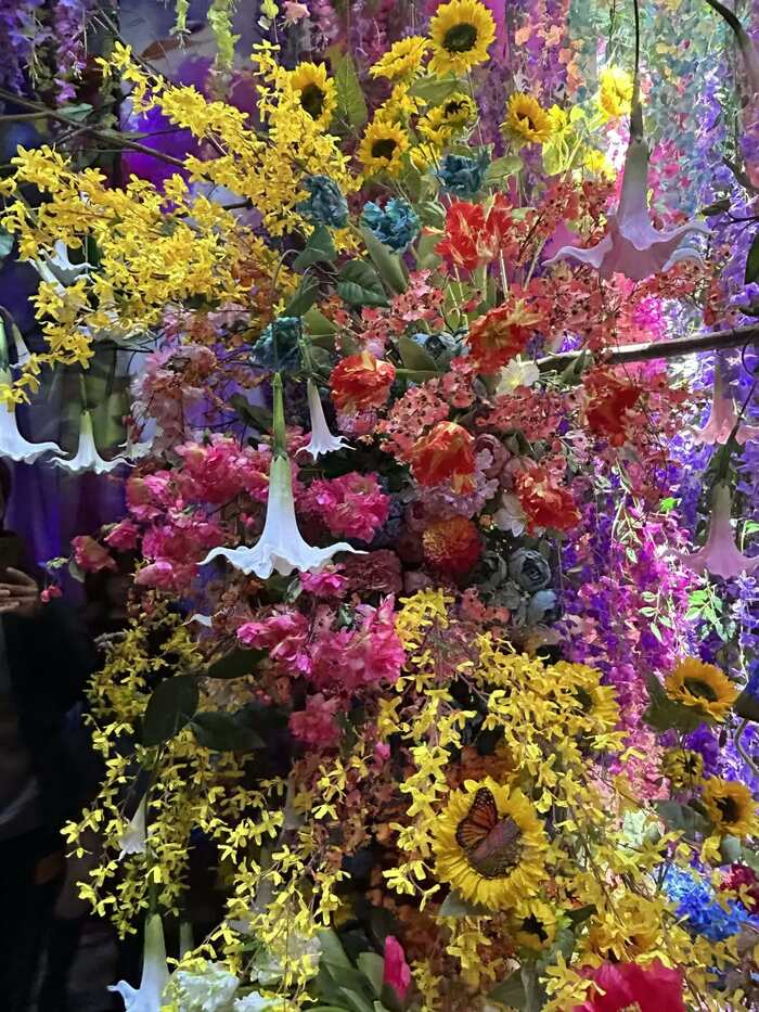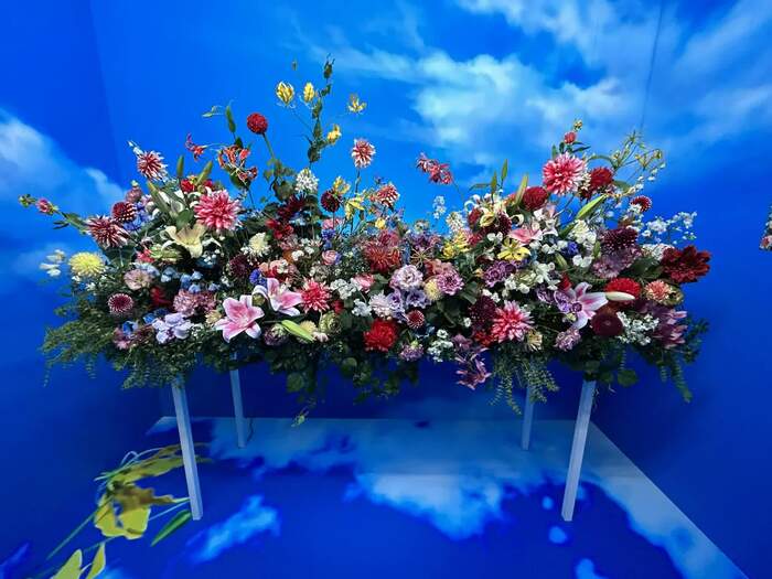「Intersecting Future 蝶の舞う景色」は、会場の中でも最も華やかな花、花、花が圧巻のエリアです。“100万色の桃源郷”という展覧会のテーマを象徴する、まさに桃源郷のような世界が広がっています。