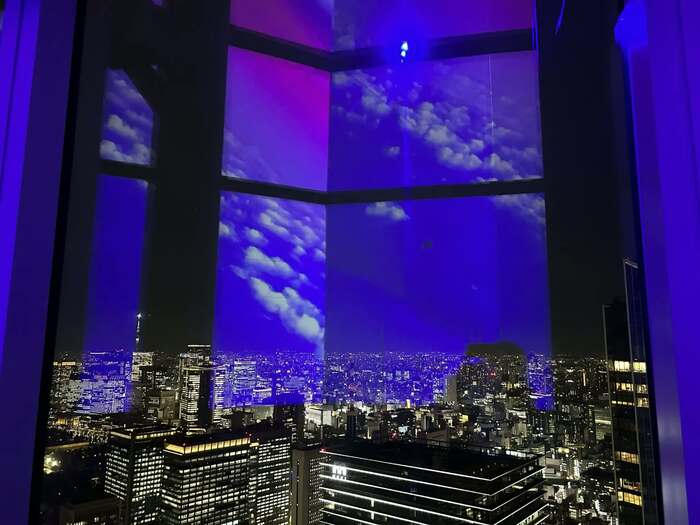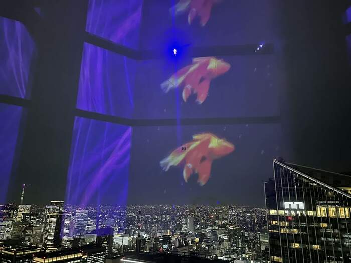 ここは45階で、夜は眼下に夜景が広がりますが、なんとその夜景に青い空が重なったり、闇夜に金魚が浮かび上がったり、と、リアルな眺望と映像とが共演!これまたアートです。