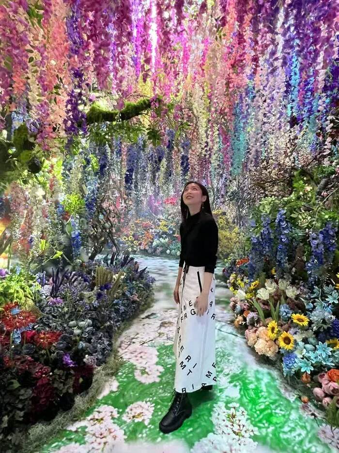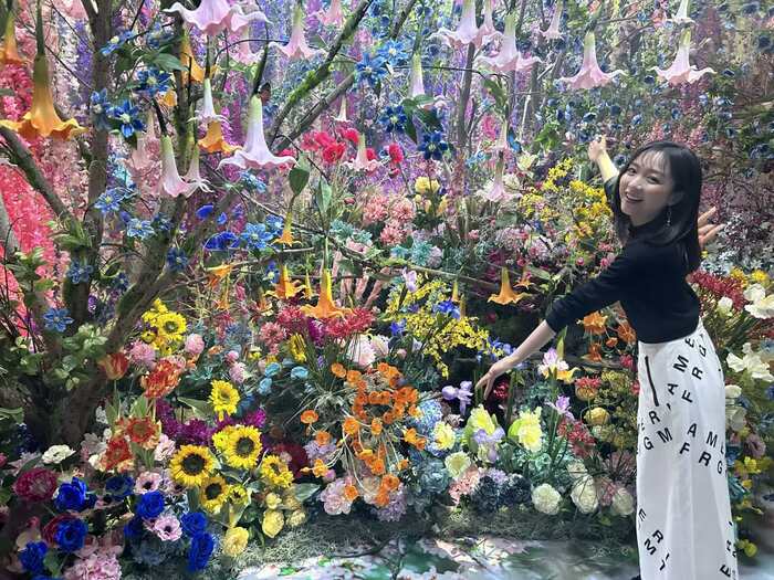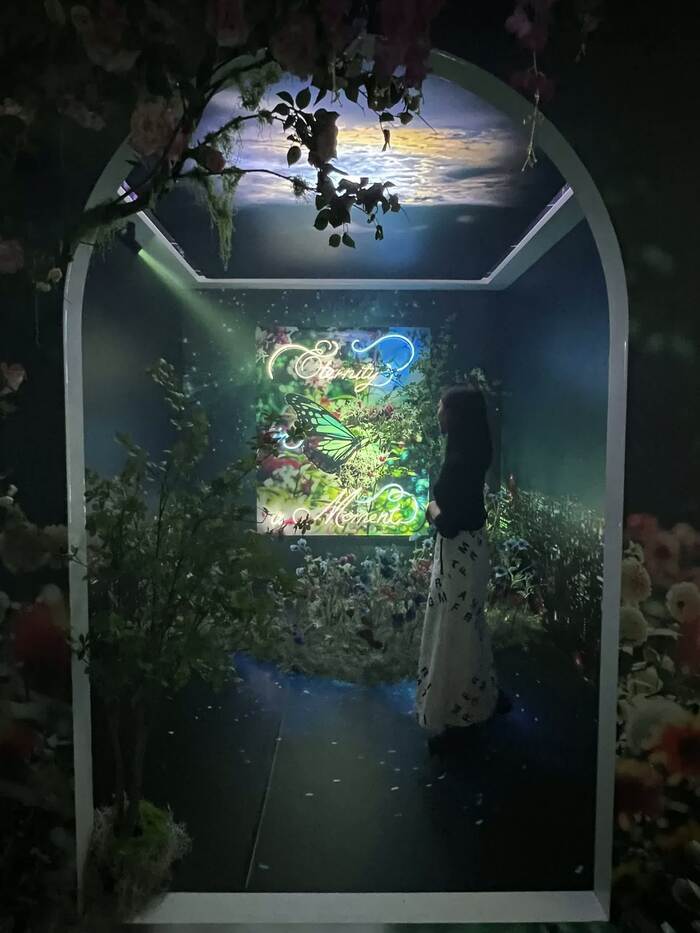 「Intersecting Future 蝶の舞う景色」の中で蜷川さんのイチオシは「Luminous Echoes」の入り口の向かい側の花園エリア。もっとも蜷川さんの展覧会だけあって、どこも“映え”スポットです。
