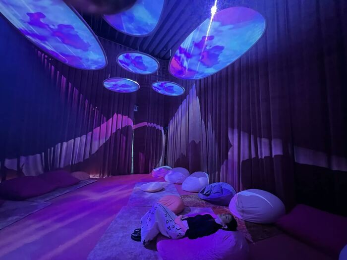 佐久間アナが「かわいい!色合いがすてき!ピンクなのに、いろいろな層のピンクがある!」と歓喜の声を上げたのが、天井には映像が流れる花弁状のスクリーン、床にはクッションが置かれた「Blooming Emotions」の空間。