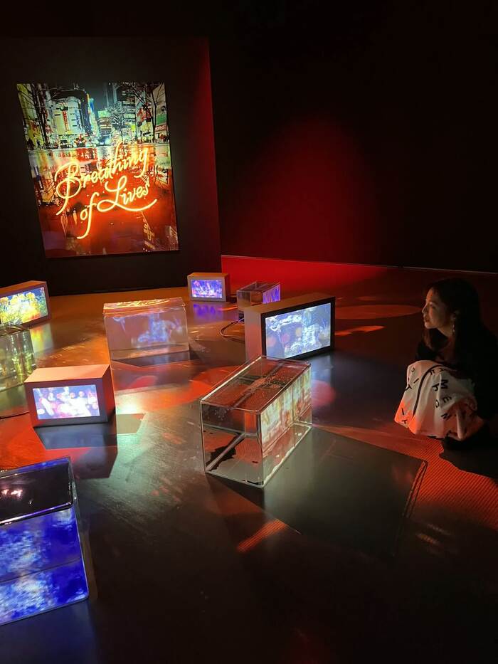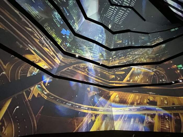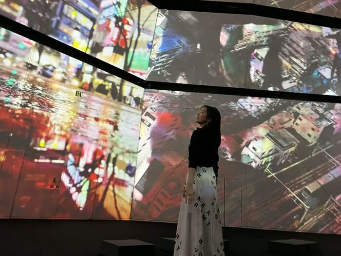 走馬灯をともに見るような映像体験ができるという「Flashing before our eyes」では、最高天高15mのドーム型空間に、都市や金魚などの映像が次々と映し出されていきます。