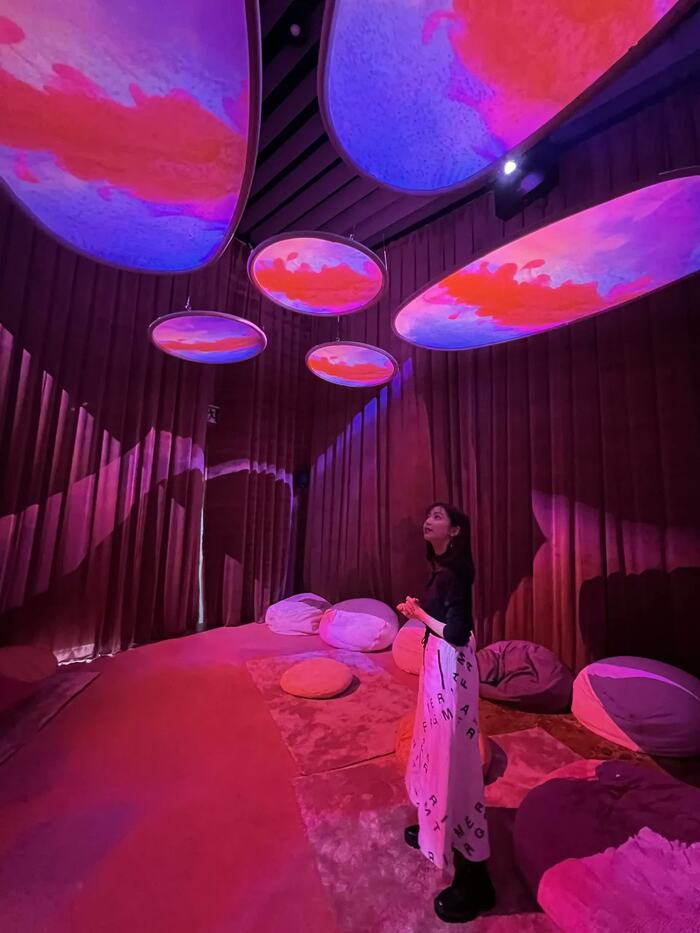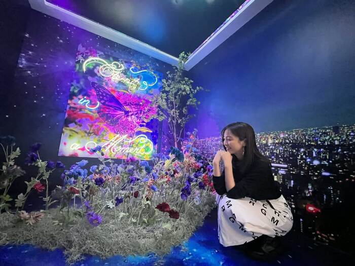もう一つの小部屋「Luminous Echoes」には、花以外に、正面にネオンライト、壁面には夜景、天井には夜空の景色が広がります。