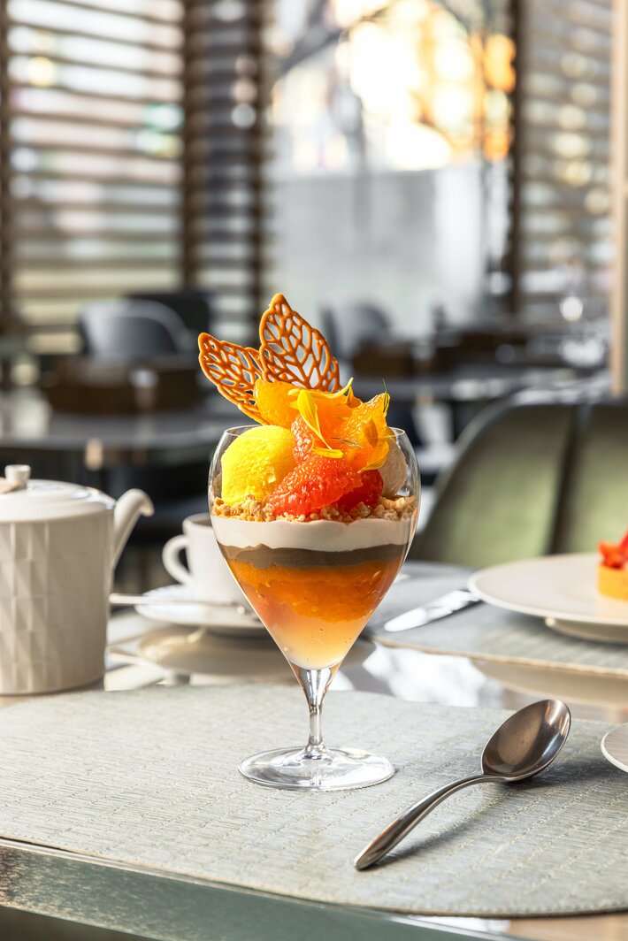 デコポンの豊かな甘みとピンクグレープフルーツの爽やかな酸味に、ミルクやほうじ茶のコクが重なり合う、春にふさわしいみずみずしいパフェ。ぜひアルマーニ / カフェでお愉しみください。