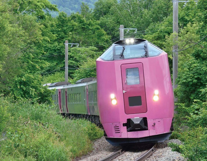 はまなすの花をイメージした車体のJRの特別貸切列車「はまなす編成」。今回のツアーのため、特別に札沼線(学園都市線)を走ります。