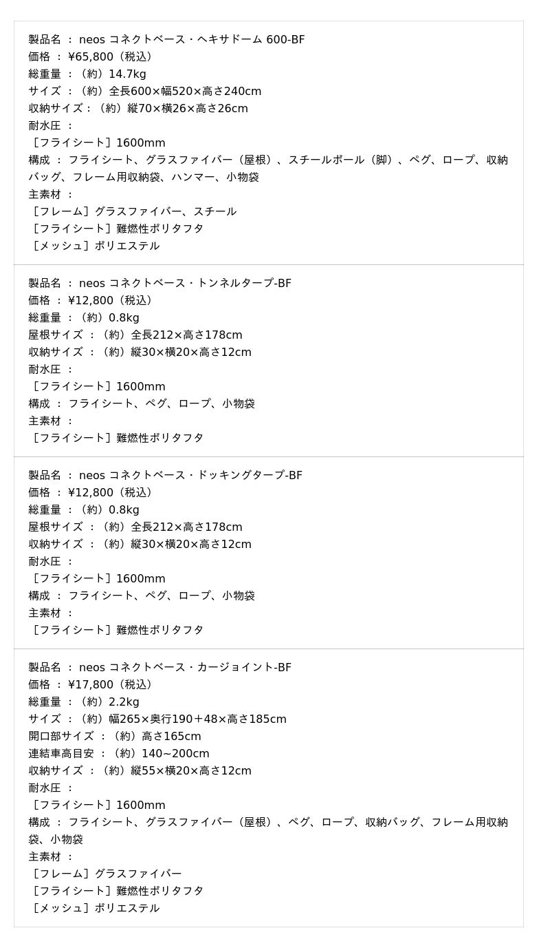 1.neos コネクトベース・ヘキサドーム 600-BF 2.neos コネクトベース・トンネルタープ-BF 3.neos コネクトベース・ドッキングタープ-BF 4.neos コネクトベース・カージョイント-BF