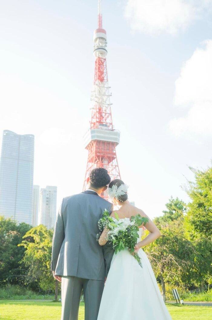 そこには、青空の下、タキシード姿の青山さんと純白ドレスをまとった妻が寄り添い、東京タワーを見つめる後ろ姿がとらえられています。