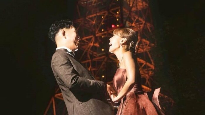 青山さんはブラウンのチェック柄タキシードに、妻はブラウンオレンジのドレスに衣装チェンジしています!温かみのある色合いがライトアップされた東京タワーと完全マッチしていて、とても華やかです。