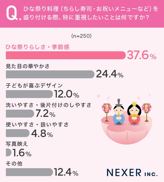 ■37.6%が、盛り付けで重視したいのは「ひな祭りらしさ・季節感」と回答
