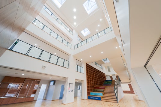 校舎中央吹き抜けに位置する本棚をあしらった大階段をシンボルとし、どこでも学べる空間を設計。