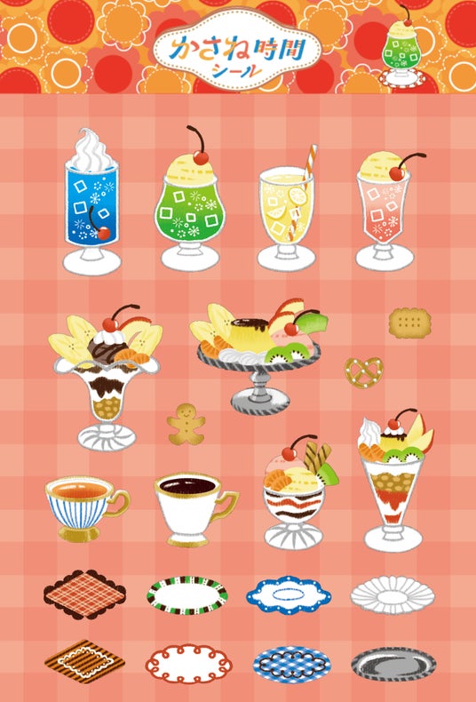 お皿とケーキ、帽子と装飾など、好きなものを自由に選んで貼って、オリジナルの組み合わせが楽しめるシールです。