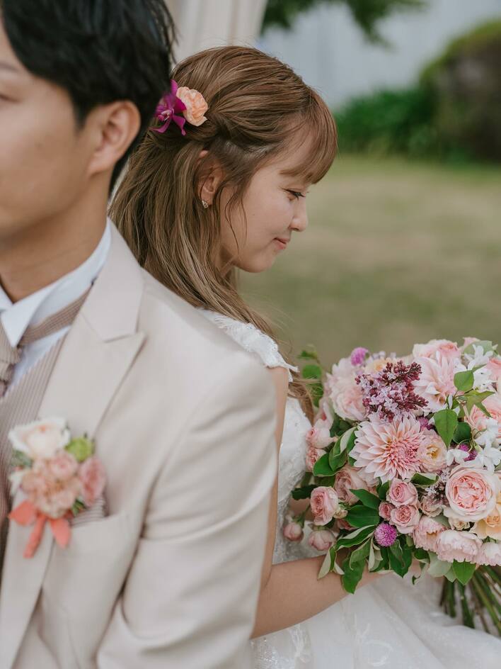 お花を付けたハーフアップスタイルで、ピンクのリボンで結ばれたブーケに視線を落とし、笑顔を浮かべていて、絵になる1枚です。