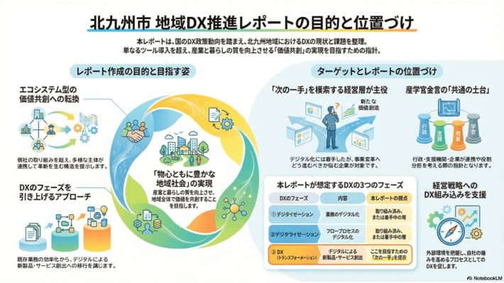 本レポートは、北九州地域のDXを「次のフェーズ」へ進めるための指針として、企業・支援機関・行政・金融機関・大学などが連携する「地域共創型DX」の方向性を提示するものです。