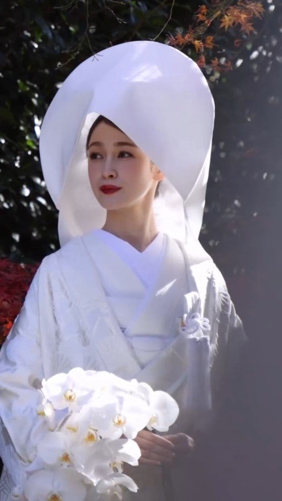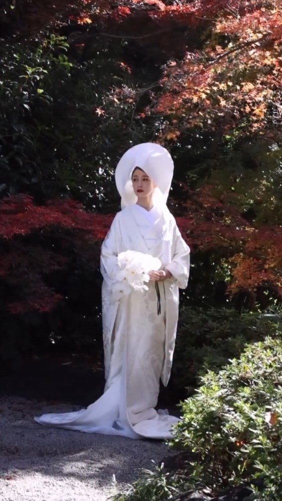 かねてより和装での結婚式を夢見ていたという藤井さんが結婚式の場所に選んだのは、広大な日本庭園が美しい会場。藤井さんは、赤や緑に染まった木々が生い茂る庭で、白無垢(むく)に身を包み、静かに遠くを見つめています。