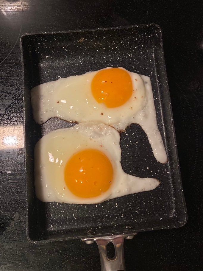 こちらが実際にフライパンで焼かれた目玉焼き。ちょっぴりユニークな形になっていますが、一体どこに何の「動物」がいるのか分かりますか?