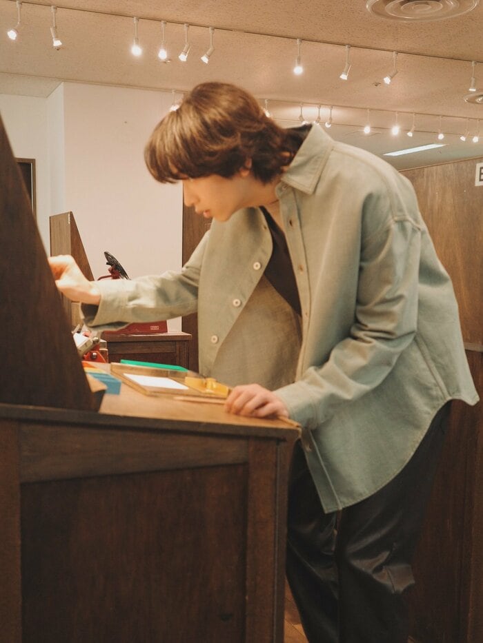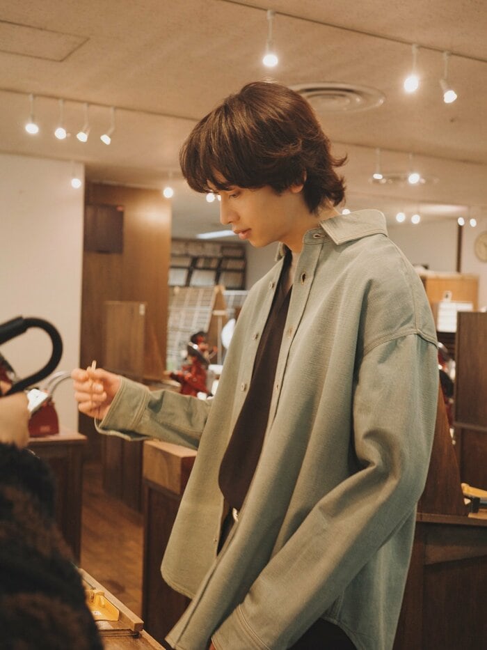 また、えんぴつを持って体験するようなショットでは、ついつい魅力あふれる横顔に見入ってしまいます。毛先がぴょんと少し跳ねたスタイリングも相まって、リラックスした雰囲気もステキです。