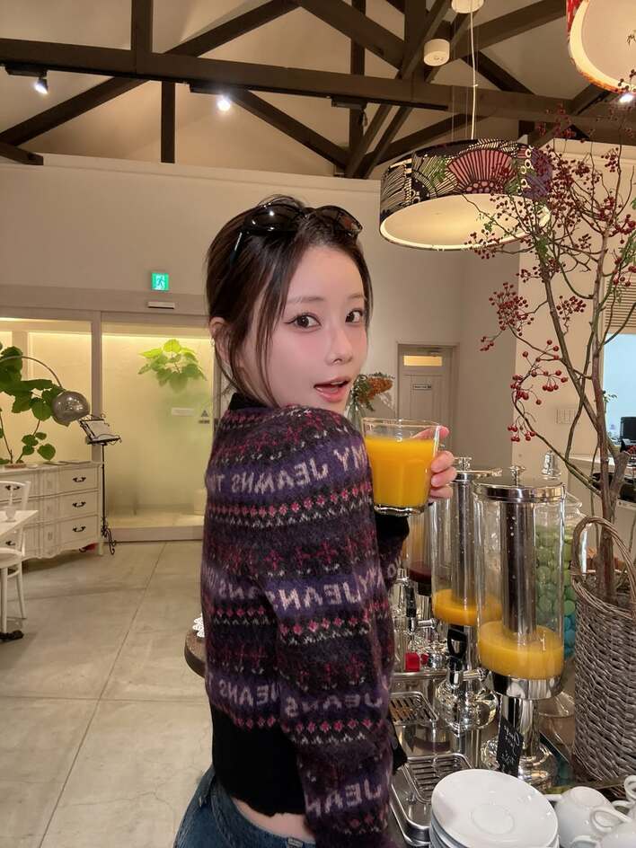 公開された写真には、ニットのカーディガンを羽織り、オレンジジュースを片手にリラックスした表情を見せる重盛さんの姿が収められています。