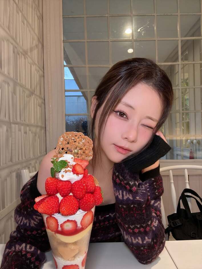 さらに、大粒のいちごがたくさんのったボリューム満点のパフェを前に、ウインクを決める様子も。