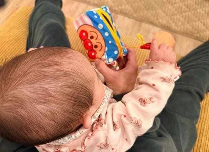夢空ちゃんは杉浦さんの足の間にちょこんとおさまるように座り、杉浦さんが持つおもちゃからひもで伸びたアンパンマンのマスコットを小さな手でぎゅっと引っ張って遊んでいます。